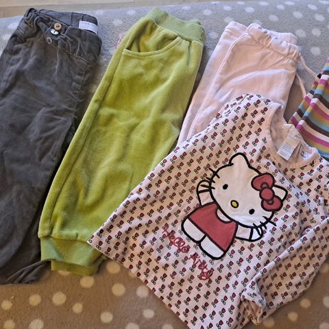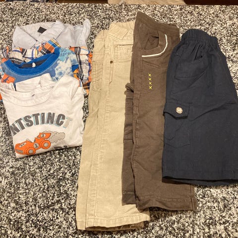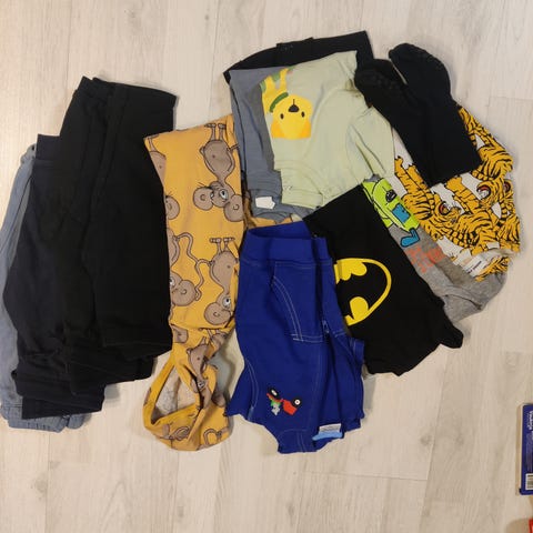 Kolme puseroa, kauluspaita, shortsit, kaksi t-paitaa, huppari, neljät housut. Kunto siisti käytetty jotain pikkuvikaa voi olla ainakin yksissä housuissa pintakangas rikki (ei läpireikä), vihreä t-paita itse tehty ja sen kunto tyydyttävä.