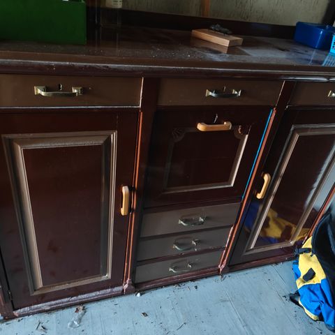 Puuta, kahvat metallia, kaikki lokerot tallessa. Ikäisekseen hyväkuntoinen, käytön jälkiä tietysti löytyy.