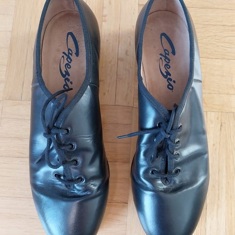 Capezion steppikengät. Näillä tanssittu lähemmäs 4 vuotta, joten jonkin verran kulumaa esim kantapäässä (ks. kuvat). On kuitenkin ehjät ja raudat kiinni.