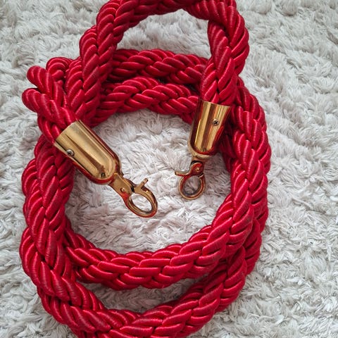 Kunnon juhlat tarvitsee näyttävän sisääntulon! Tässäpä 8 kpl hopeanväristä tolppaa (90cm) ja 6 kpl samettipintaisiarajausköysia hopeanvärisillä papukaijalukoilla. Köyden kokonaispituus heloineen 230cm kpl eli näillä saa tehtyä 6 metriä pitkän köysillä rajatun käytävän. Tolppien jaloissa pieniä jälkiä mutta köydet on uutta vastaavassa kunnossa.