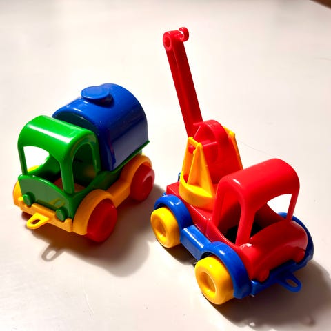 Kaksi pienten lasten leluautoa ja ukkelit.