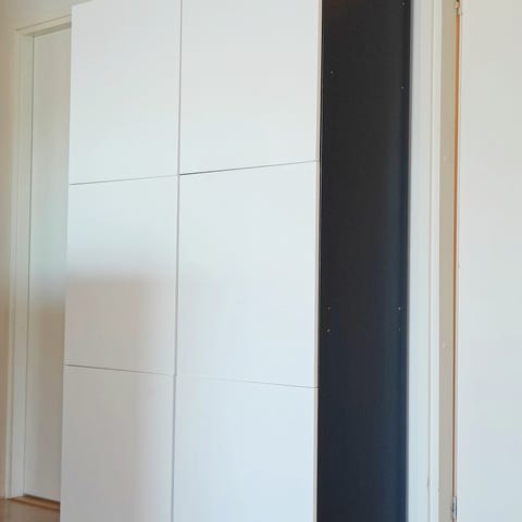 Ikean BESTÅ seinäkaappiyhdistelmä, jossa yhdistetty kolme erillistä kaappia. Mukana seinäkiinnityskiskot.