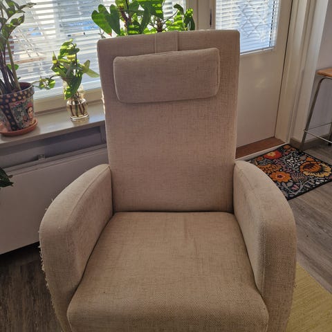Myydään IKEAn musta nojatuoli, jossa keinujalat. Selkänoja voidaan asettaa kahteen asentoon. Rungon maali on takaa jaloista kolhiintunut. Tyynynpäällisissä irrotettavat kankaat 100% puuvillaa ja konepestävät. Toiselta puolelta aurinko vähän haalistanut mutta voidaan värjätä uudestaan.