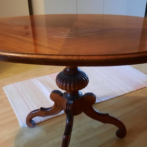 1940-luvun soikea pöytä, joka on koristeellista rokokootyyliä. Hienot kaiverretut yksityiskohdat pöydän reunoissa ja jalassa.
