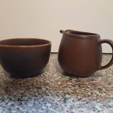 Myydään vintage kermakko & sokerikko. Kannu virheetön, pohjassa patinaa (ei säröjä). Maalipinnat molemmissa ajan hengessä tehty aikanaan, ei täydelliset. 😄 Rasiassa pienen pieniä riskuja yläreunassa ja lehdessä, ei haittaa käyttöä. Kansi pysyy paikalla vain pöydällä ollessa.