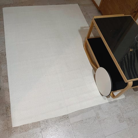 Napakkaa puuvillaa oleva raitamatto, jossa mustavalkoinen väritys. Käytetty, hyvä kunto, juuri pesty. Parin sentin pienen haalean tahran löysin tarkasta tiiraamalla. Koko noin 130x200cm. Kissatalous