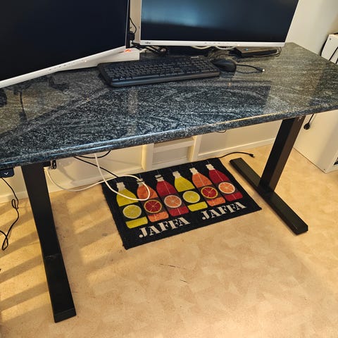 Pöydässä yksi tehokas moottori, joka valmistajan mukaan jaksaa nostaa 70kg. Valkoinen työtaso myös kestävää materiaalia.