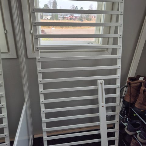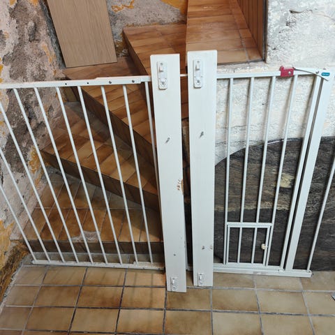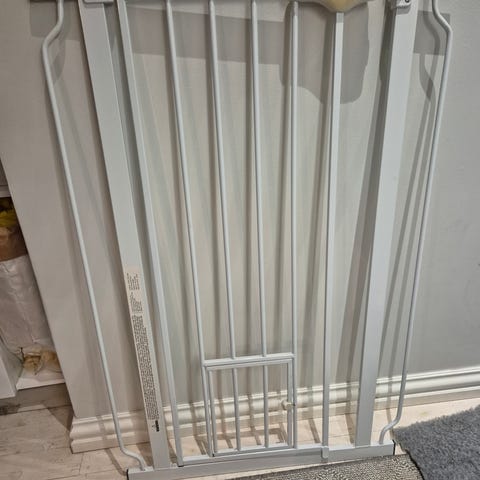 Vuorokauden käytössä ollut Carlson korkea lemmikkiportti. Pientä hampaan jälkeä portin alaosassa (näkyy toisessa kuvassa). Ovh 79,90€.