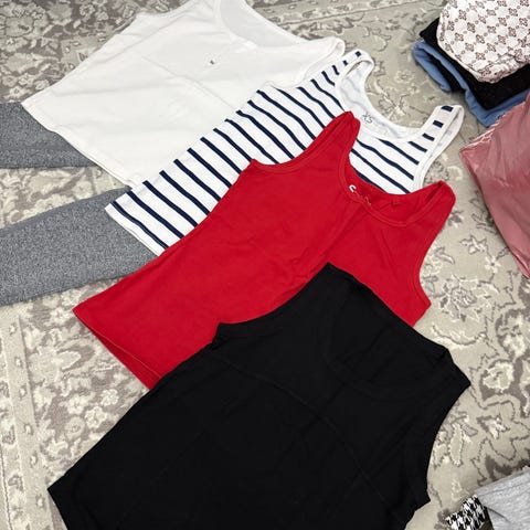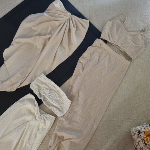 Täysin sekalainen setti naisten vaatteita, joista muutamasta erillinen nopee kuva. Parit housut, paitoja, urheiluvaatteita, mekkoja, hameita. Käytettyä ja käyttämätöntä. Jotkut menevät M kokoisellekin. Hyvä setti vaikka kirpparille vietäväksi.