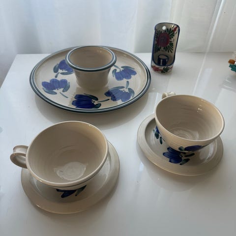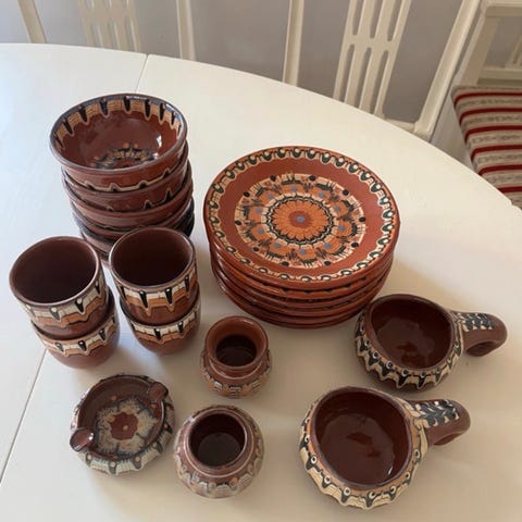 Keittiöastiasetti, joka sisältää useita keramiikkaesineitä eri kokoisina.