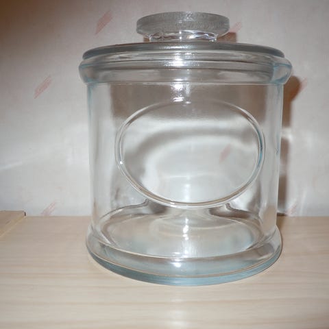 Säilytyspurkki, korkeus 10,5 cm ja kannen kansa 14 cm, halkaisija 11 cm, tilavuus 6 dl.