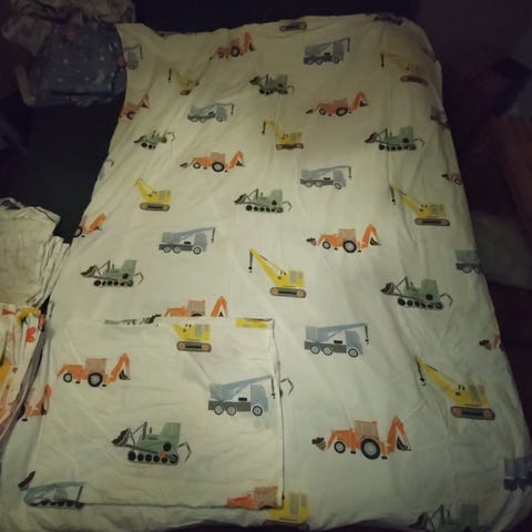 Normaalikokoinen työkone aiheinen pussilakanasetti. Vähän käytetty, hajusteeton/hajuton.