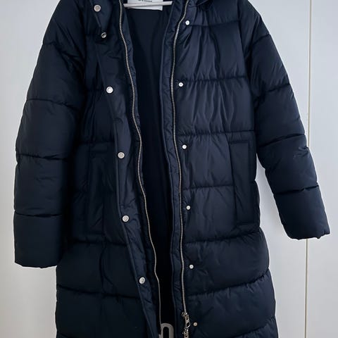 Pieneksi mennyt , hyvässä kunnossa, musta untuvatakki, jossa lämpimät resorit kauluksessa ja hihansuissa.