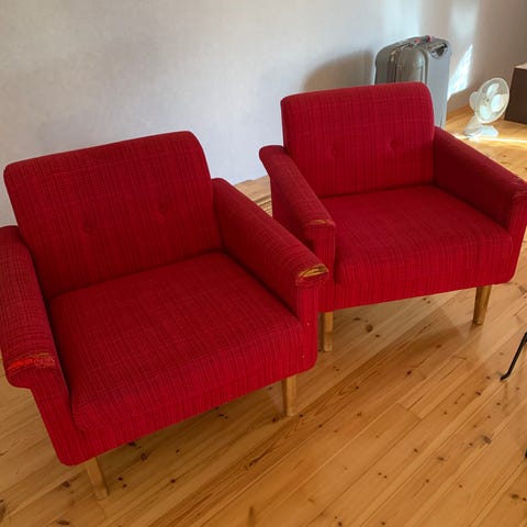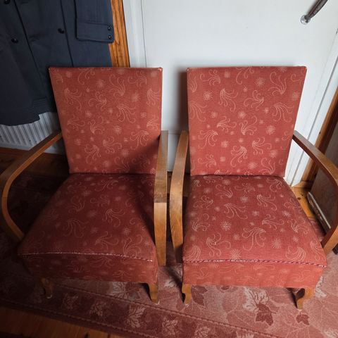 Alkuperäisellä kankaalla,vähän istuttu tuolipari , näitä ei tarvitse eikä kannata verhoilla. Alkuperäistä arvostavalle. Hinta 400,-. Ryhmässä olleet samanoloinen sohva (kulumaa) 80,-, sekä pöytä 80,- . Nouto Orimattila.
