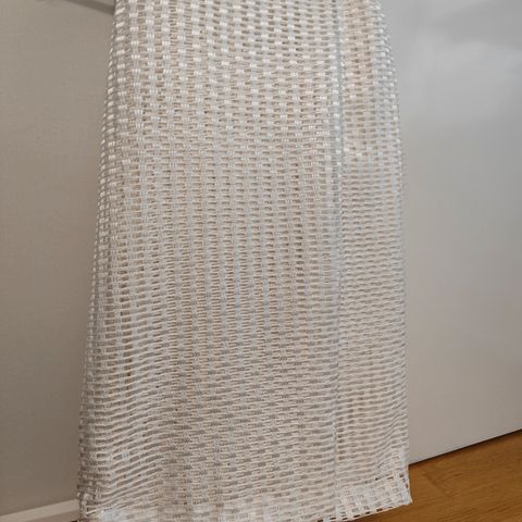 2 kpl hieman läpikuultavaa verhoa. Verhot ovat lyhennetty 212 cm pituisiksi. Käänne jätetty kuitenkin taitteeseen joten purkamalla mahdollista saada noin 245 cm pituisiksi. Lemmikitön talous.