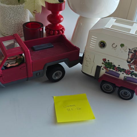 Myydään Schleich auto ja traileri vuodelta 2011. Hyvä leikitty kunto, autosta puuttuu ratti.