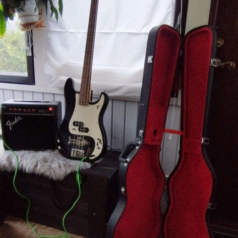 Tarjolla hieman harvinaisempi Green Dayn basistin nimikko-Squier. Ikäänsä nähden erittäin siistissä kunnossa, vain muutamia lähes huomaamattomia naarmuja ja kolhuja.