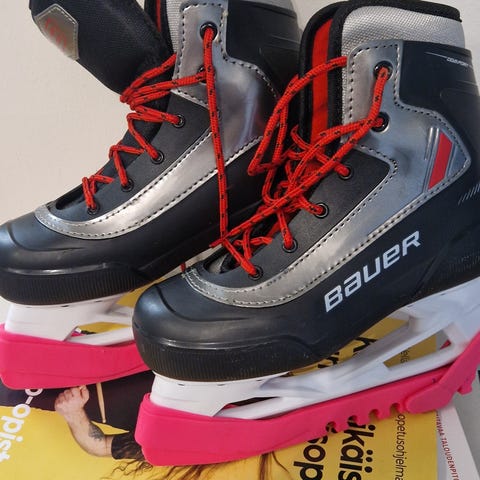 Lasten harjoittelu luistimet kahdella terällä. Kokoa pystyy säätämään pohjassa olevasta ruuvista. Muutaman kerran käytössä olleet meillä. Todella siistissä kunnossa!