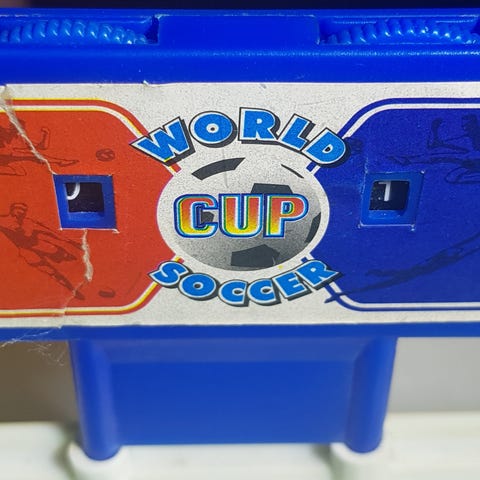 Vanha jalkapallopeli 90-luvulta. Saa pöydälle tai omille jaloille. Mukana 2 palloa. Pohja vähän kuperaksi mennyt, mutta voi näinkin pelata, jos ei rahasta pelaa tai sitten jollain painoilla varmasti oikenisi.