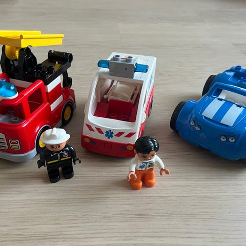 Hyväkuntoiset duplon paloautot ja helikopteri seuraavalle leikkijälle.