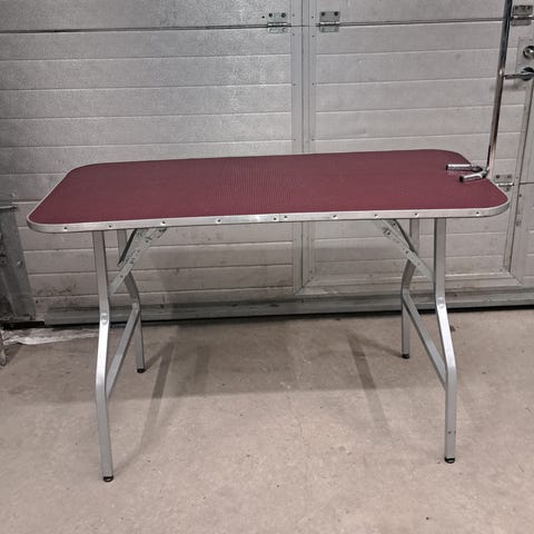 Koiran trimmauspöytä mustalla työtasolla ja kromatulla tukirungolla. Pöydässä on säädettävä kaulahihna ja taitettavat jalat, jotka helpottavat säilytystä ja kuljetusta. Sopii koirien turkin hoitoon ja trimmaamiseen.