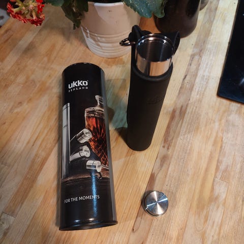Ukko 100 taskumatti valmistettu ruostumattomasta teräksestä. Korkki, alkuperäinen pakkaus, sekä nahkatuppi, jossa kantolenkki