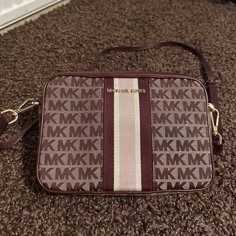 Hyväkuntoinen nahkainen laukku, hopeanväriset yksityiskohdat ja säädettävä hihna. Sisällä monta pikkutaskua. Muutama pieni jälki pinnassa, näkyy kuvissa.