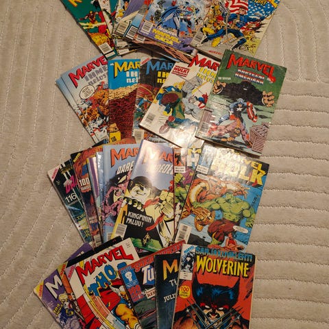 Kokoelma sarjakuvalehtiä, jotka sisältävät Batman, Ryhmä-X, Hämähäkkimies ja Marvel Ihmeneloset. Mukana on useita numeroita eri vuosilta, kuten 1982, 1988, 1989 ja 1990. Lehtien kannet ovat värikkäitä ja niissä on tunnettuja hahmoja.