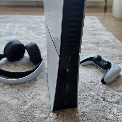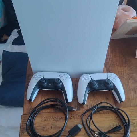 Sony PlayStation 5 pelikonsoli, mukana kaksi ohjainta (valkoinen ja musta), useita kaapeleita ja tarvikkeita. Konsoli on varustettu modernilla suorituskyvyllä ja tarjoaa monipuoliset pelimahdollisuudet.