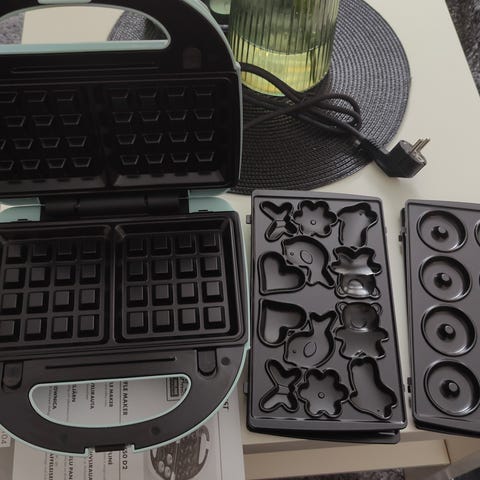 Laite on valmistettu ruostumattomasta teräksestä, ja siinä on kaksi vohvelialustaa suorakaiteen muotoisille herkuille.