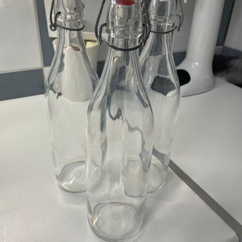 Seitsemän tyhjää pientä Coca cola lasipulloa. En huomaa vikoja.