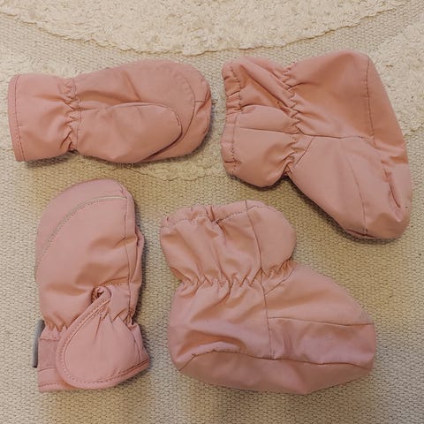 Itse neulotut pesukarhu tumput. Koko 6-18kk. Käyttämättömät