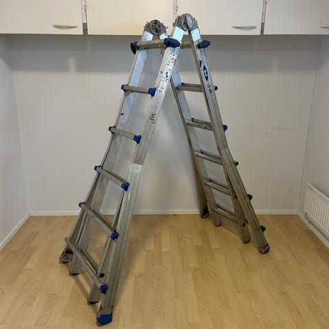 Alumiininen taitettava tikas, joka soveltuu monipuoliseen käyttöön. Tikkaat ovat kevyet ja helposti siirrettävät, ja ne voidaan taittaa kokoon säilytystä ja kuljetusta varten.