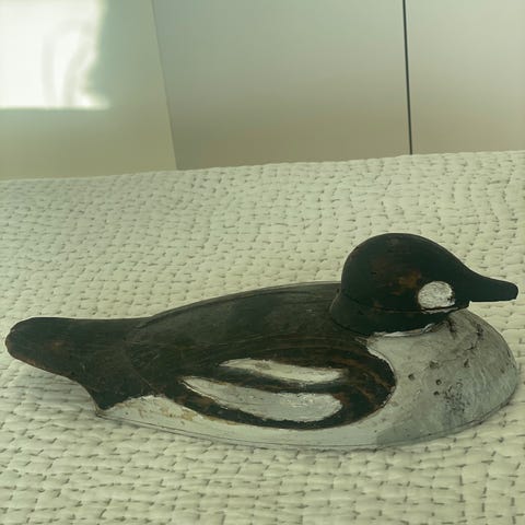 Hieno vanha puinen houkutuslintu. Tehty todennäköisesti 1900-luvun alkupuolella. Muuten hyväkuntoinen, mutta maali vähän rapissut etuosasta. Koko 28cm x 12cm korkeus 10cm.