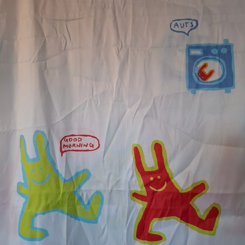 Lähes käyttämätön suihkuverho ja kiinnitysrenkaat