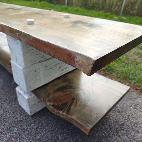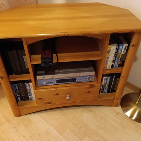 Kuultolakattu valkoinen tv-taso mäntyä. Päälitaso aikanaan lakattu tummanruskeaksi, nyt taas hieman naarmuinen.