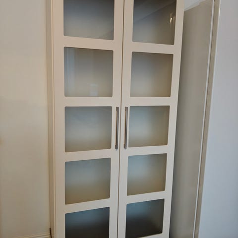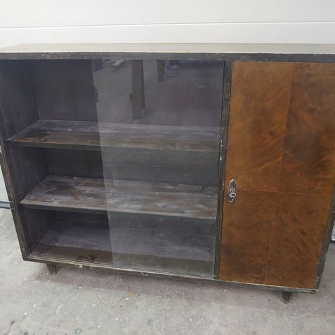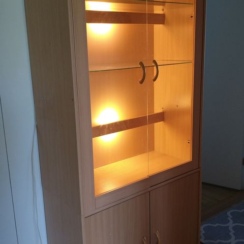 Hyväkuntoinen männystä valmistettu vitriinikaappi.