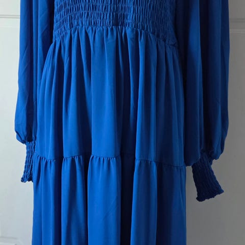 Joelle (Ellos) tummansininen ohutta polyesteriä oleva mekko koossa 44, hyvä 42-44 kokoiselle. Empire tyylinen yläosa, laskeutuva kaksinkertaista kangasta oleva helma. Uudenveroinen. Kainalo-kainalo takaa 53 cm, olka-helma 140 cm. Kainalon alla sivulla vetoketju.