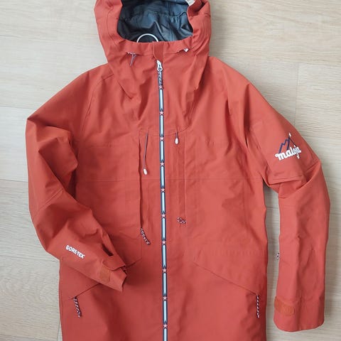 Malojan hyvökuntoinen vedenpitävä Gore-Tex-takki lasketteluun ja muuhun ulkoiluun. Istiuva malli. Ventit kainaloissa ja säädettävä iso huppu. Hihassa tasku laskettelulipulle.