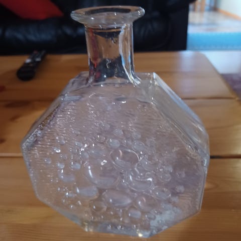 Kolme kaunista lasiesinettä aurinkopullo, lasmaljakko tai kulho ja lasipullo.