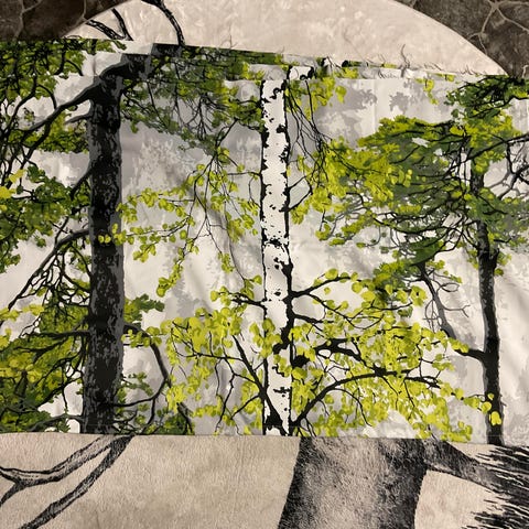 2 kpl Tähtien alla -blackout-verhoja, joista toinen ostoverho ja toinen itse samasta kankaasta ommeltu, mistä syystä saumassa on taustapuolella ryppyjä. Etupuolelta kestää katselua. Tosi kiva kuosi lastenhuoneeseen!