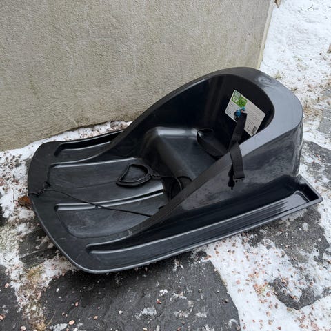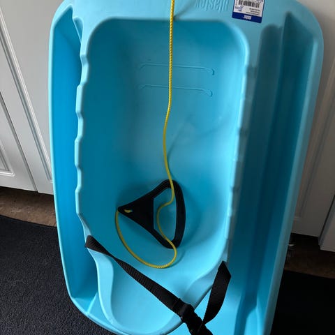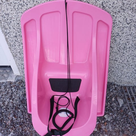 Muovinen pulkka, väriltään pinkki. Varustettu vetonarulla ja turvavyöllä. Noudettavissa Hakuninmaalta.