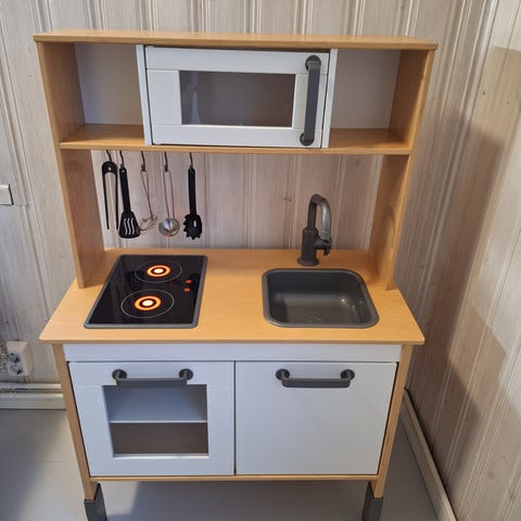 lasten leikkikeittiö harmaa. Keittiössä on liesi, uuni, pesuallas ja säilytystilaa ovien takana. Materiaali on pääosin puuta ja muovia. Soveltuu lasten leikkeihin ja roolipeleihin.