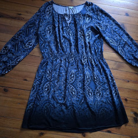 Elloksen sininen mekko jossa tyköistuva kuminauharypytetty yläosa, reilut hihat korkealla kuminauhakiristyksellä ja frillahelma. Uudenveroinen. Alla joustava sininen vuori. Rinnanympärys 90-110 cm, olka-helma 116 cm.