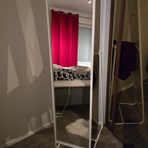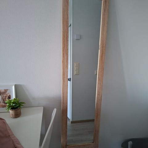 Siistikuntoinen iso lattiapeili, jonka taakse voi hillota vaikkapa puolipitoisia vaatteita.