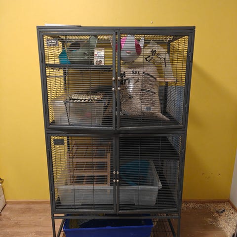 Metallinen critter nation häkki, noin 4v vanha. Hyvässä kunnossa, mutta puuttuu muvitasot sekä rampit. Häkki on parista kohtaa haljennut, mutta ei ole ollut suuri ongelma. Hampaan jälkiä ja muutamia naarmuja, mutta tekee tehtävänsä.