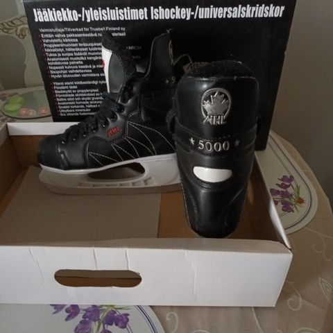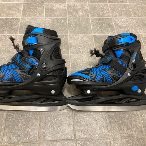 Lasten luistimet koko 38 mustavalkoisella värityksellä. Soveltuvat jääkiekkoon.