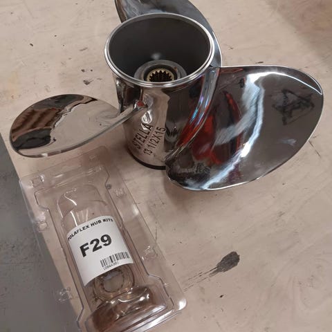 Perus siisti kuntoinen potkuri. Jotain pikku naarmua löytyy. On ilmeisesti joskus hiottu ja maalattu uudestaa. On testattu honda 90hv ja vetää hyvin.
