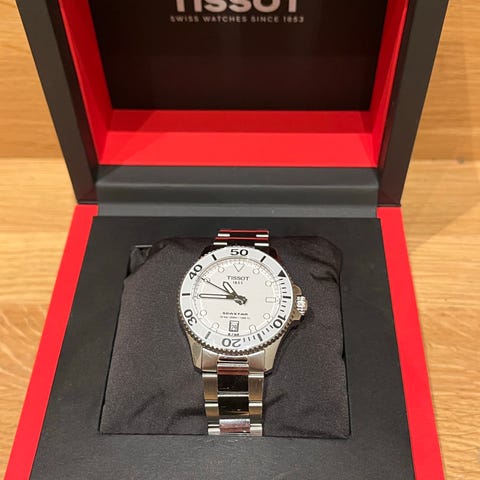 Malli: Tissot Seastar 1000 Chronograph mustalla kellotaululla varustettu miesten urheilukelloViite: T120.417.11.051.00Ruostumaton teräsKellonäytön väri: MustaKotelon koko: 45,5 mm (ilman kruunua)Koko: Enintään 19,0 cm ranteeseen.Koneisto: Sveitsiläinen kvartsikronografikoneistoVirranvaraus: Enintään 2 vuotta.Aikakellon pitäminen/ ajankäyttötoiminnot, hacking (sekuntien pysäytys), lume-osoittimet ja tuntimerkit, päivämäärän näyttö, EOL (akun käyttöiän loppumerkki), 30 minuutin ja 1/10 sekunnin laskurit, Keskus 60 sekunnin kronografin osoitin, ADD- ja SPLIT-toiminnot, lume-osoittimet ja tuntimerkit, pyörivä sukelluskiekko, ruuvikiinnitteiset kruunut.—// TOIMITUKSEN SISÄLLÖT //—Alkuperäinen laatikko: Kyllä (Tissot-kellon laatikko. Tyynynpidin on hieman rikki sovituksen vuoksi)Alkuperäiset asiakirjat: Kyllä (takuuopas ja käyttöohje)Takuu: Kyllä *(1 vuoden rajoitettu takuu Chrono Addictilta)*—// EHDOT //—Kulumaa tapauksessa: Ei mitäänEi kulumaa takakannessa.Käytön jälkiä kristallissa: Ei mitään*(Safirikristallin yläosa antiheijastavalla pinnoitteella)Kellotaulun kulumia: Ei mitään *(Super Luminova osoittimet ja tuntimerkinnät)Käytössä käsissä: Ei mitäänRannekellon kehyksessä: Ei mitäänKruunun kuluminen: Ei mitäänEi mitään.KUNTOARVIOINNIN STANDARDI:Ei mitään (Paras) > Merkityksetön > Pieni > Keskitaso > Raskas > Vaurioitunut (Huonoin)— // KOKONAISARVIO //—ARVIO: NARVOSTELUN OHJEUusi, ilman käytön merkkejä.S - Lähellä uuden kuntoa, ilman kulumisen merkkejä.A+ - Erinomaisessa kunnossa, vähän käytetty ja vähän kulumisen merkkejä.A - Hyvässä kunnossa, kevyitä käytön merkkejä tai naarmuja.B+ - Kohtalaisessa kunnossa, jossa on ilmeisiä kulumisen tai naarmujen merkkejä.B - Huonokuntoinen, runsaasti kulumisen merkkejä tai naarmuja.V - yli 20 vuotta vanha ja vintage-kunnossa, jossa on ilmeisiä kulumisen ja naarmujen merkkejä.ND - Pelastustilassa, toimimaton tai huoltoa vaativa. Saattaa puuttua osia.—// Toimitustapa //—PALVELU: FedEx Economy tai vastaava—[[[ Asiakkaille huomautuksia ]]]—ValokuvatKaikki kuvat eivät ole retusoidu (paitsi sarjanumeroiden osalta, jotka on piilotettu turvallisuussyistä). Mahdolliset virheet, joita ei ole mainittu kuvauksessa mutta jotka näkyvät kuvissa, katsotaan kuuluvan kuvausten piiriin. Kuva kertoo enemmän kuin tuhat sanaa, joten pyydämme teitä tarkastelemaan kuvia huolellisesti ennen tarjouksen tekemistä, sillä ne muodostavat olennaisen osan kuvauksesta. Arvostan asiakassuhdettani, enkä halua olla pettymys, kun tavarat saapuvat ei-toivottujen tulosten kanssa.tarkkuusTarkkuus testataan jokaisessa kellossa vaakasuorassa asennossa (näyttö kasvot ylöspäin) täysin ladatun vararajan ollessa käytössä, ja sitä pidetään tyydyttävänä ajan pitämisen kannalta ennen kuin se lähetetään liikkeelle myymälästämme. Joitakin tekijöitä, jotka voivat vaikuttaa tarkkuuteen, ovat esimerkiksi ranteessa vietetty aika, käsivarren ja ranteen liikkeet sekä jännitys voiman springissä. Yli 10 vuotta vanhoissa kelloissa saattaa esiintyä suurempaa tarkkuuden vaihtelua ja epätasaisuutta mekaanisen kulumisen vuoksi.AitousYritän merkitä kaikki jälkimarkkinatavat osat, jotka pystyn tunnistamaan ja parhaani mukaan. Arvioi kohteen kuvien perusteella, sillä ne on otettu varsinaisesta tuotteesta, jonka tulet vastaanottamaan. Kirjallinen kuvaus on vain apuväline, jos kuvat eivät näytä vikaa täydellisesti.