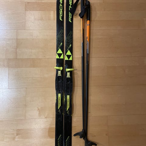 Lasten Fischer perinteisen sukset jonkinlaisella pitopohjakuvioinnilla. Pituus 117cm, NNN-siteet. Sekä sauvat 90cm. Näitä on käytetty yhdessä, mutta voin myydä myös erikseen.